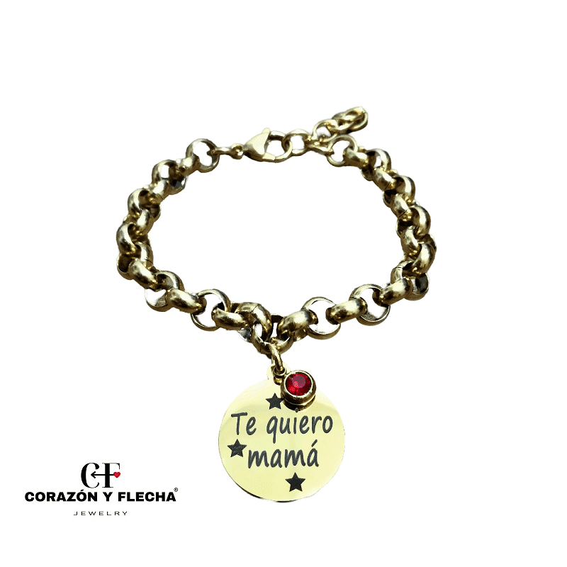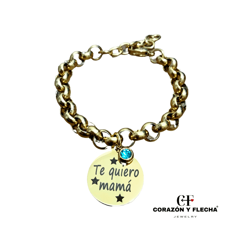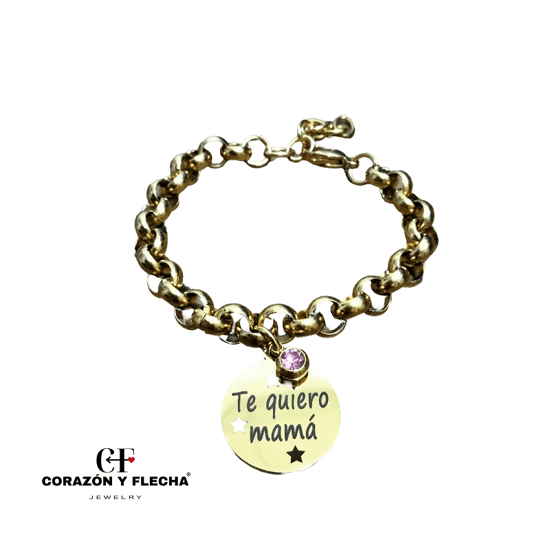 Pulsera mujer acero dorado, personalizada con chapa redonda de 19 mm, detalle de cristal, medida 16+3cm.