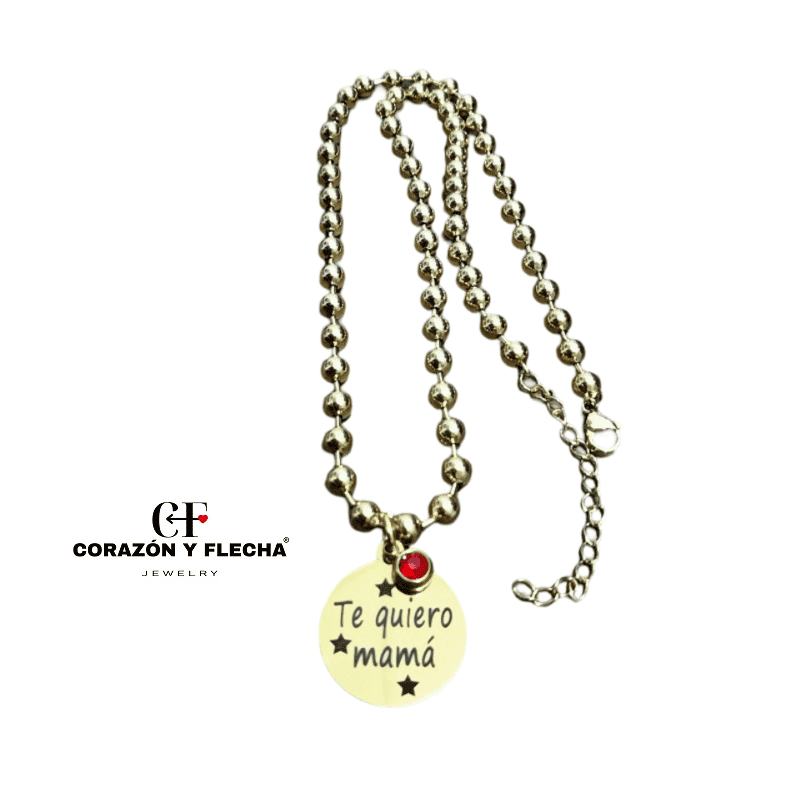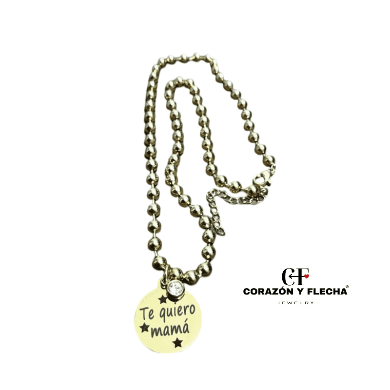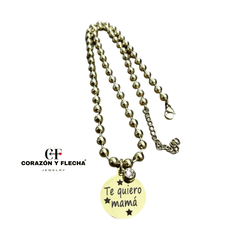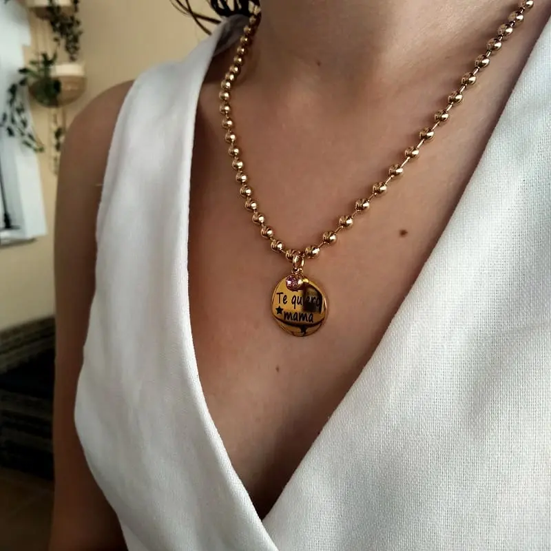 Colgante mujer de acero dorado, personalizado con chapa redonda de 19mm, con detalle de cristal, codena con bolitas de 45+5cm.