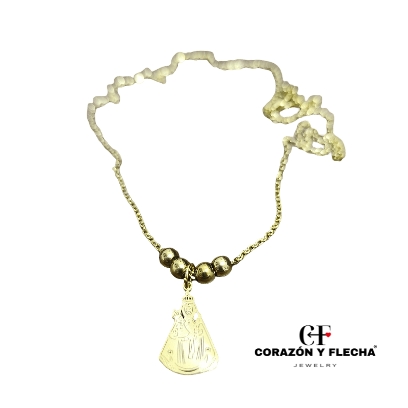 Colgante de acero dorado con bolitas Virgen de la Fuensanta, medidas 45+5cm.