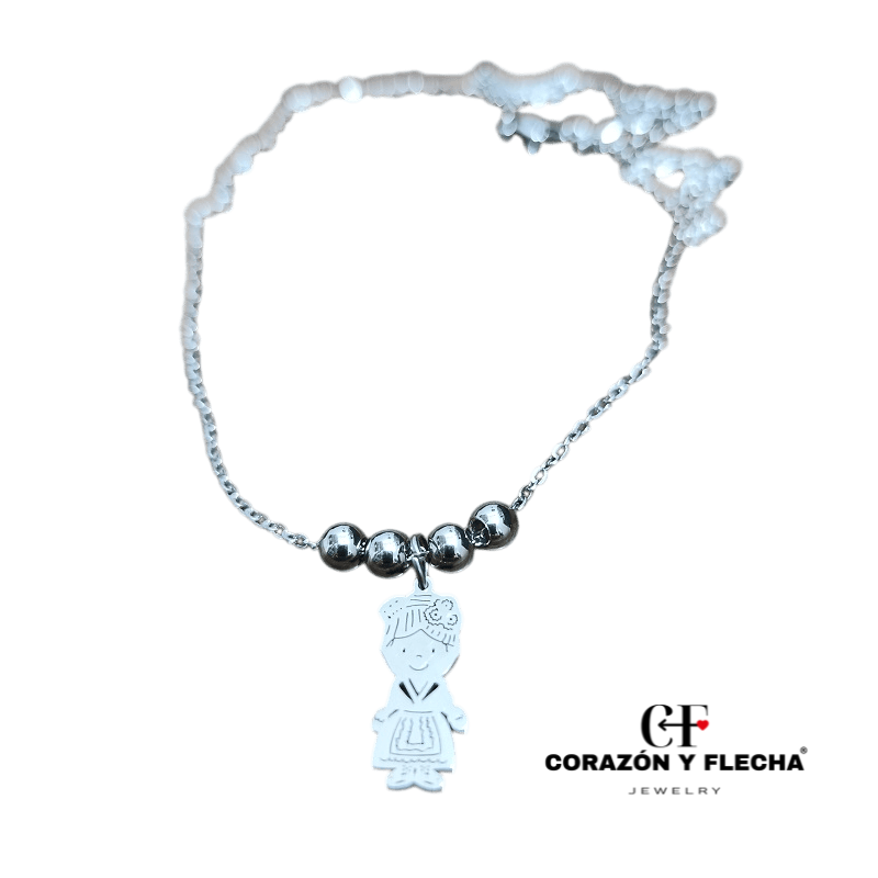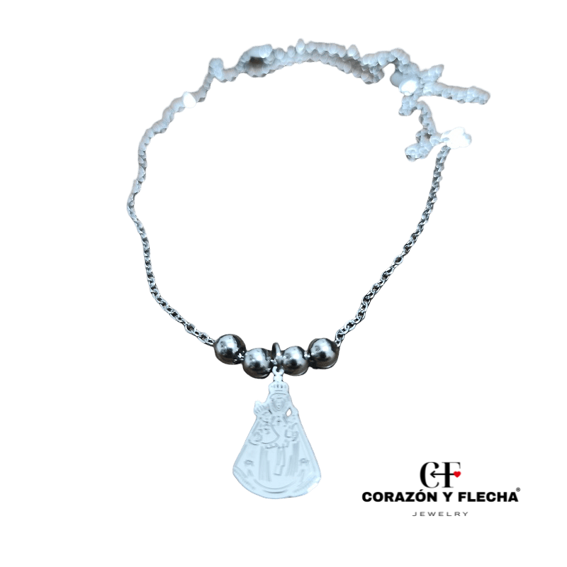 Colgante acero plateado con bolitas Virgen de la Fuensanta, medidas 45+5cm.