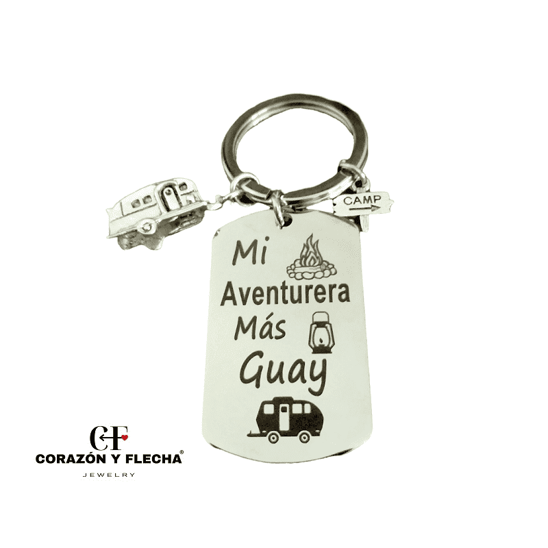 Llavero mujer de acero Aventurera con dos colgantes de adorno, medidas 48x28mm, personaliza la cara b con foto o texto.