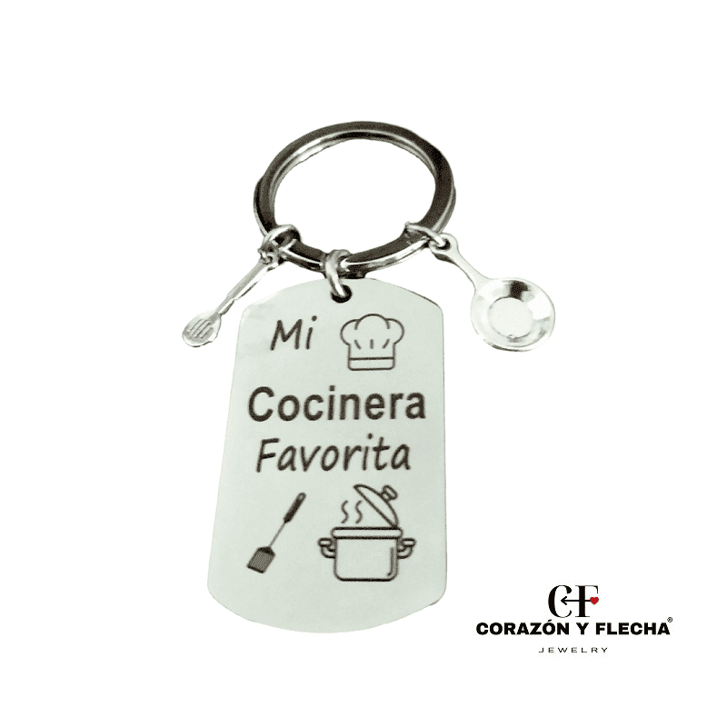Llavero mujer de acero Cocinera con dos colgantes de adorno, medidas 48x28mm, personaliza la cara b con foto o texto.