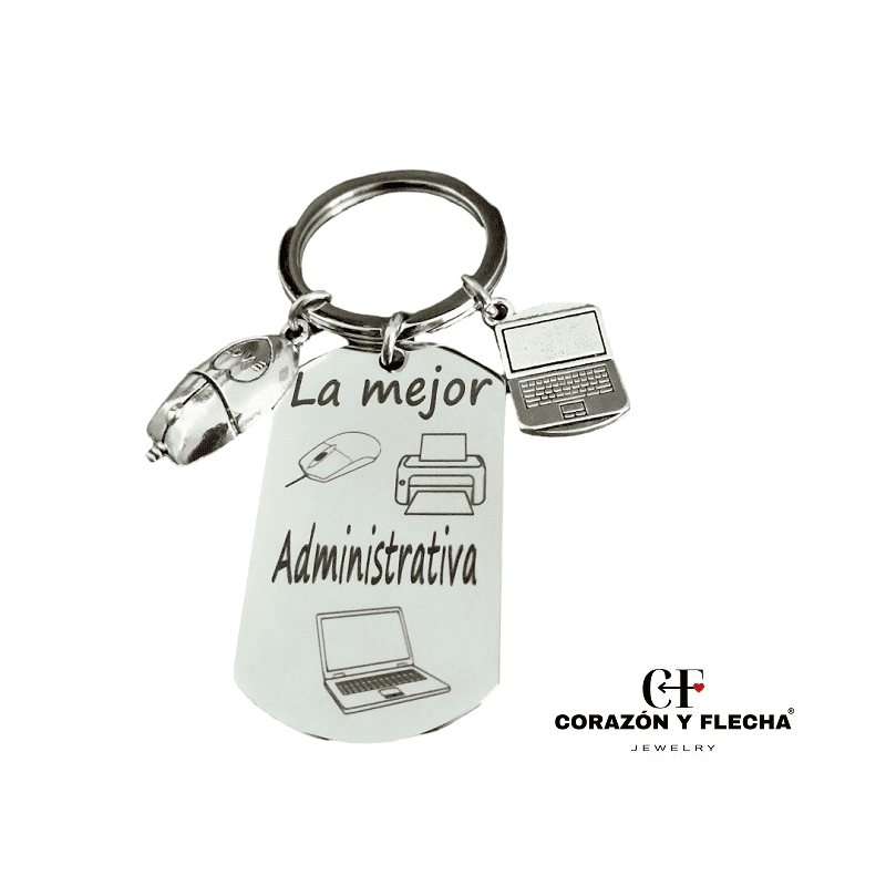 Llavero mujer de acero Administrativa con dos colgantes de adorno, medidas 48x28mm, personaliza la cara b con foto o texto.