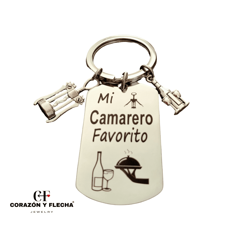 Llavero hombre de acero Camarero con dos colgantes de adorno, medidas 48×28, personaliza la cara b con foto o texto.