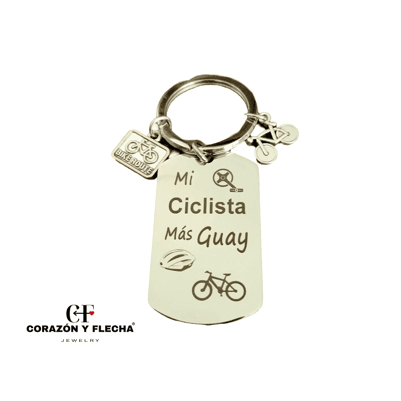 Llavero unisex de acero Ciclista con dos colgantes de adorno, medidas 48x28mm, personaliza la cara b con foto o texto.