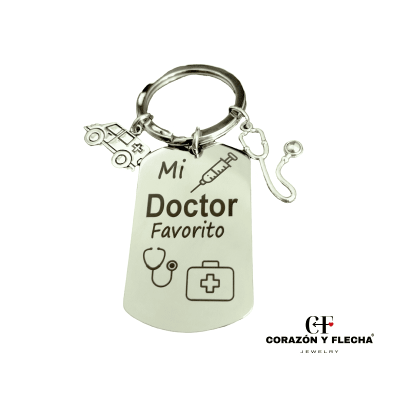 Llavero hombre de acero Doctor con dos colgantes de adorno, medidas 48x28mm, personaliza la cara b con foto o texto.
