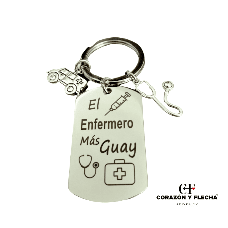 Llavero hombre de acero Enfermero con dos colgantes de adorno, medidas 48x28mm, personaliza la cara b con foto o texto.