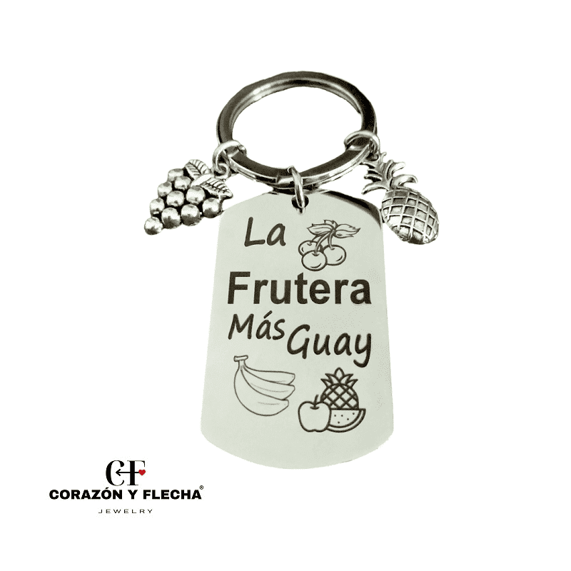 Llavero mujer de acero Frutera con dos colgantes de adorno, medidas 48x28mm, personaliza la cara b con foto o texto.