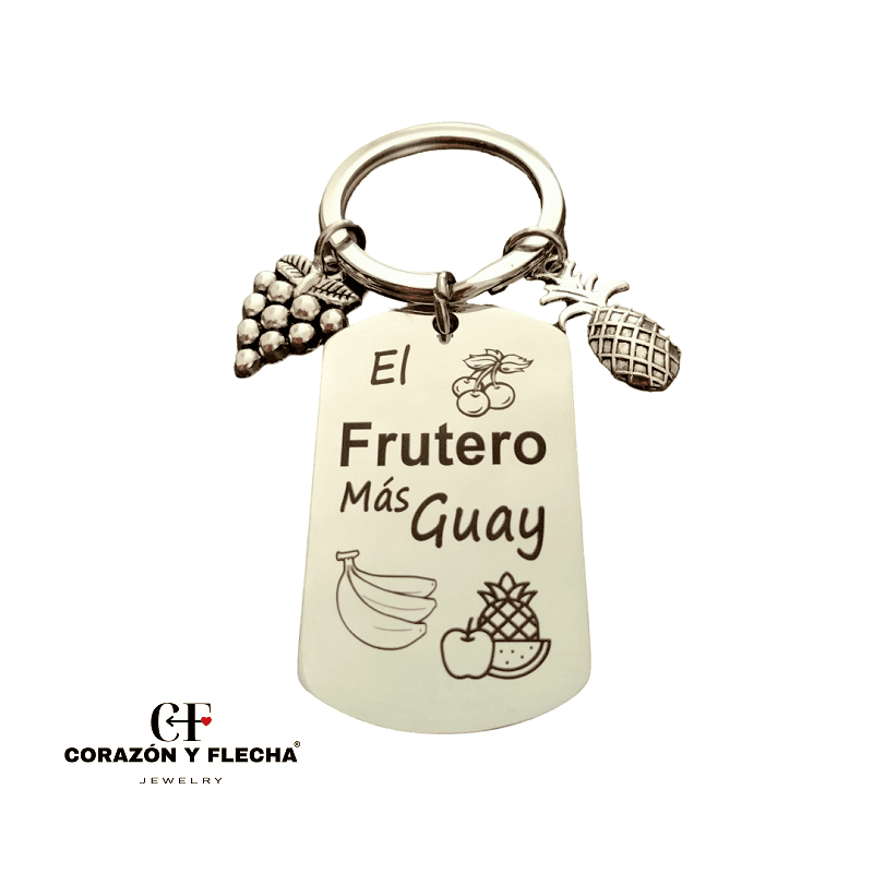 Llavero hombre de acero Frutero con dos colgantes de adorno, medidas 48x28mm, personaliza la cara b con foto o texto.