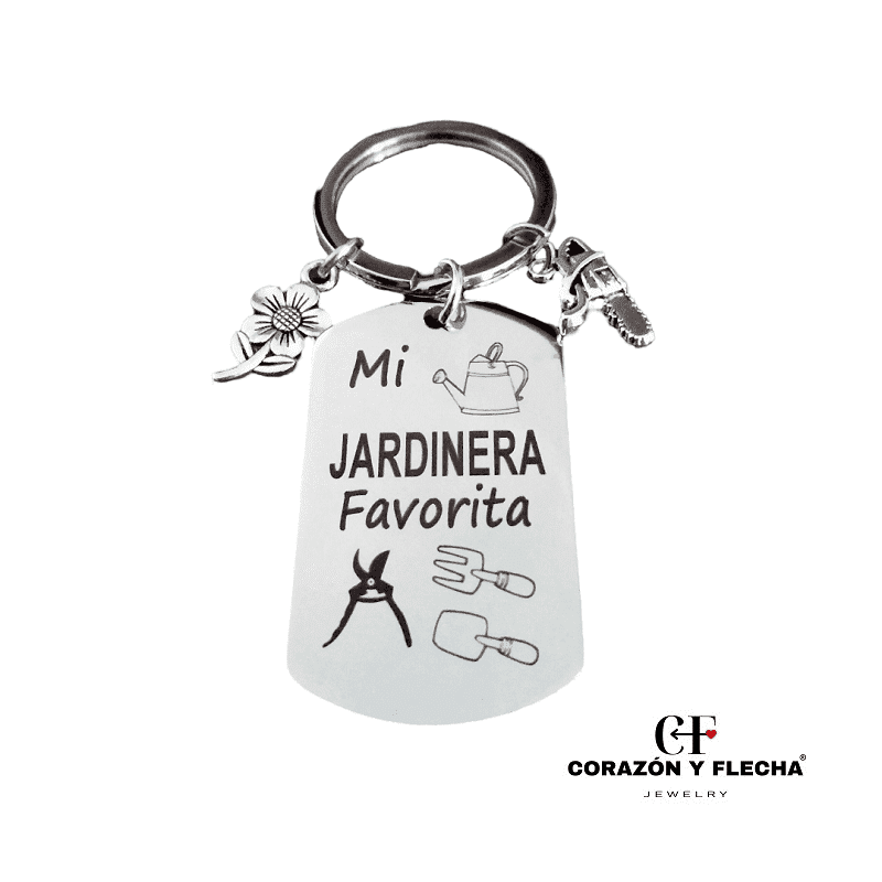 Llavero mujer de acero para Jardinera con dos colgantes de adorno, medidas 48x28mm, personaliza la cara b con foto o texto.