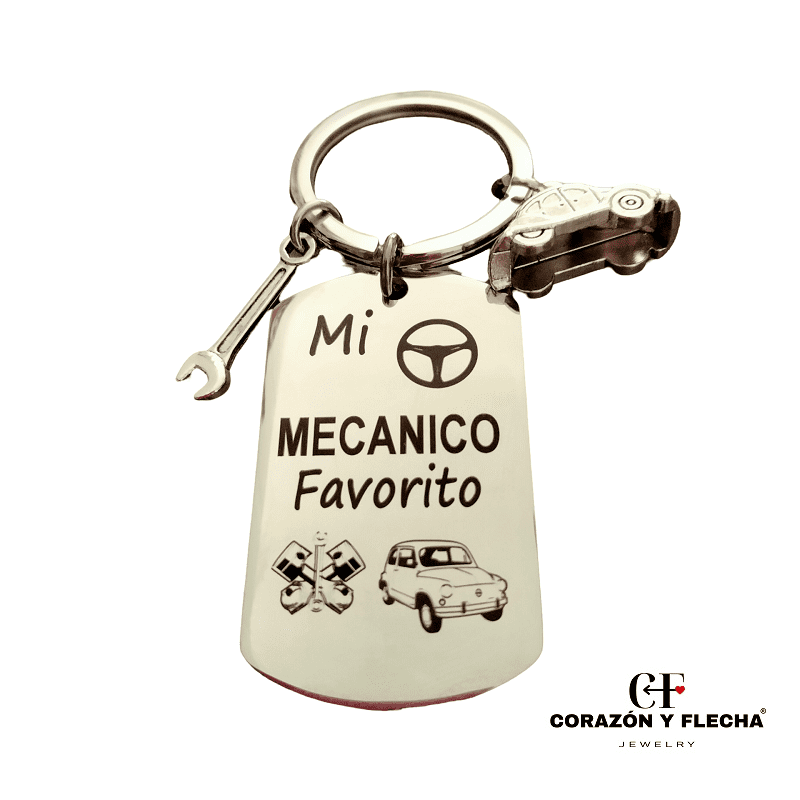 Llavero hombre de acero Mecánico con dos colgantes de adorno, medidas 48x28mm, personaliza la cara b con foto o texto.