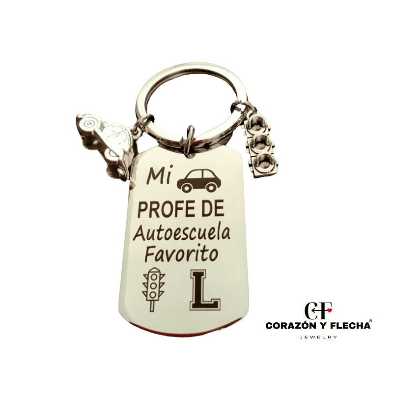 Llavero hombre de acero Profesor Autoescuela con dos colgantes de adorno, medidas 48x28mm, personaliza la cara b con foto o texto.