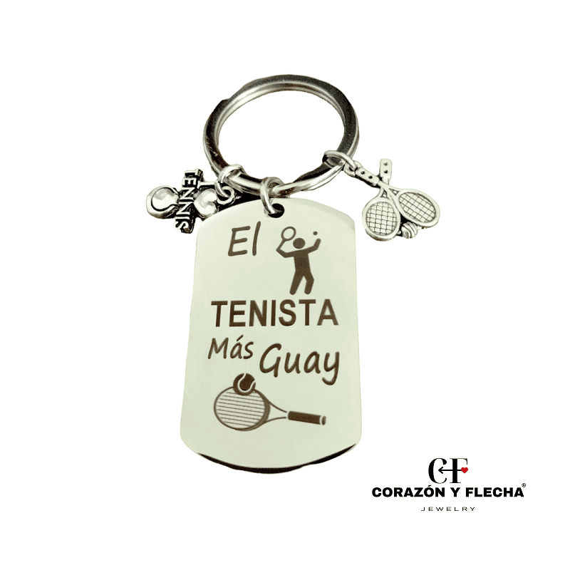 Llavero hombre de acero Tenista con dos colgantes de adorno, medidas 48x28mm, personaliza la cara b con foto o texto.