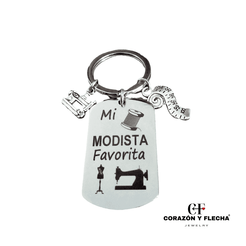 Llavero mujer de acero Modista con dos colgantes de adorno, medidas 48x28mm, personaliza la cara b con foto o texto.