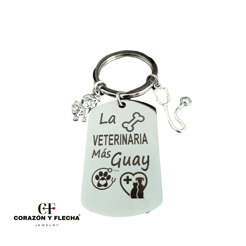 Llavero mujer de acero Veterinaria con dos colgantes de adorno, medidas 48x28mm, personaliza la cara b con foto o texto.