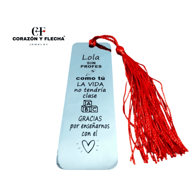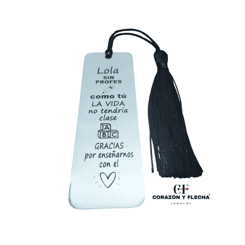 Marcapáginas de acero personalizado con dedicatoria especial para profes, con nombre del profesor o profesora y nombre de alumnos, dedicatoria, fecha, nombre del cole, incluye borla decorativa, ideal para fin de curso o agradecimiento.