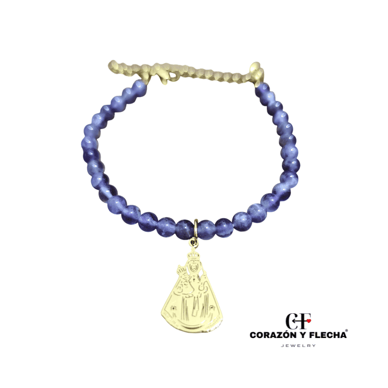 Pulsera de mujer piedra amatista con Virgen de la Fuensanta de acero dorado, medida 14+5cm.