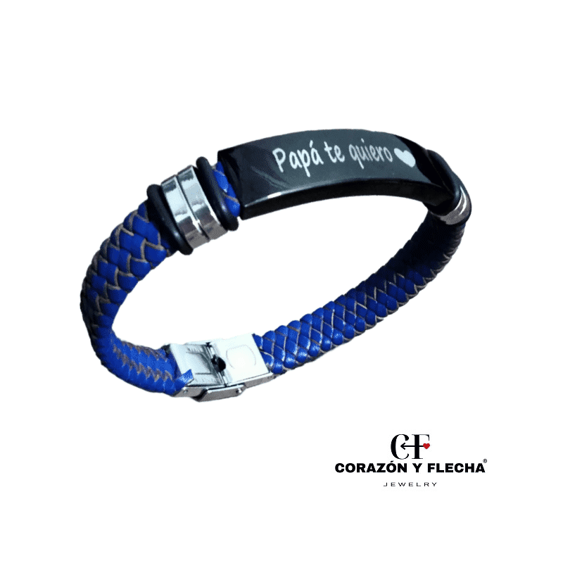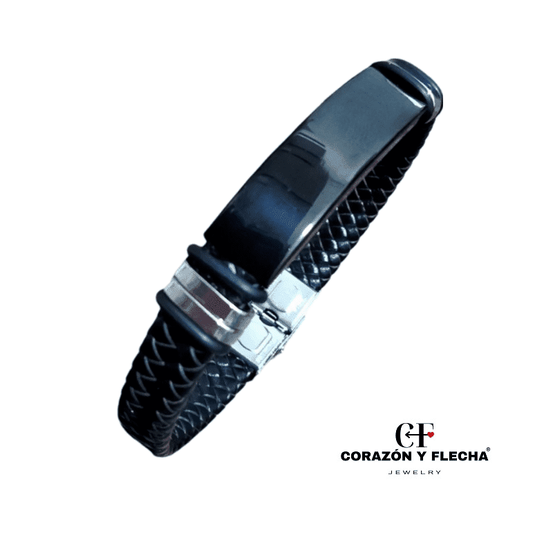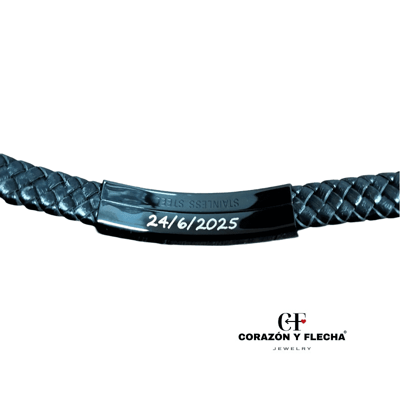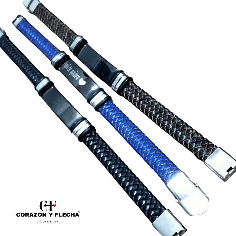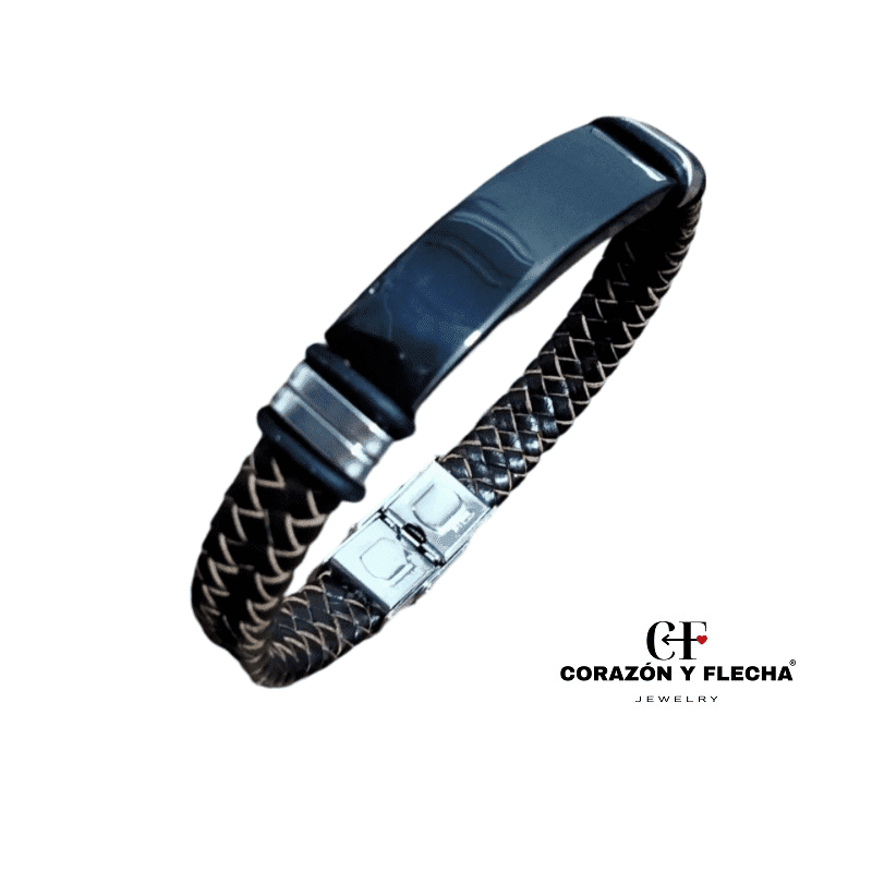 Pulsera hombre de acero negro y cuero, personalizada cuero trenzado colores negro, marrón y azul , cierre de acero plateado, chapa de acero negra 40x10mm, medida pulsera 20 cm de largo por 1cm de ancho, se puede cortar y adaptar a cualquier muñeca.