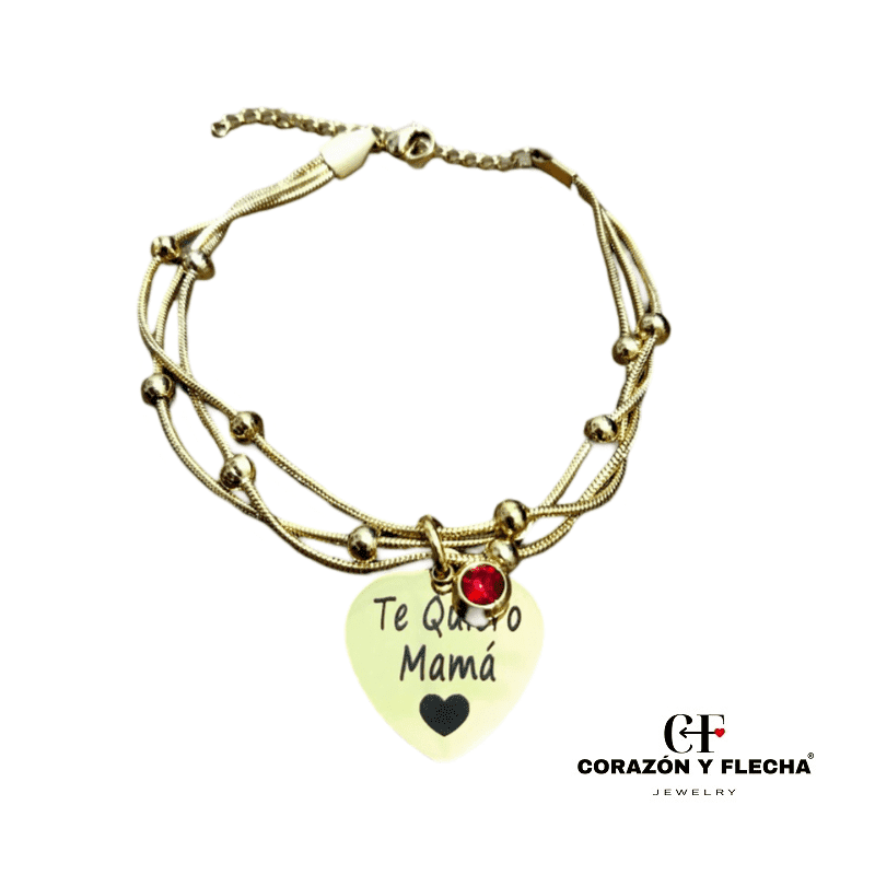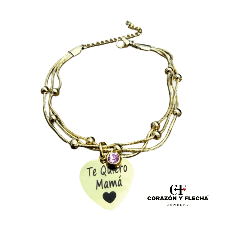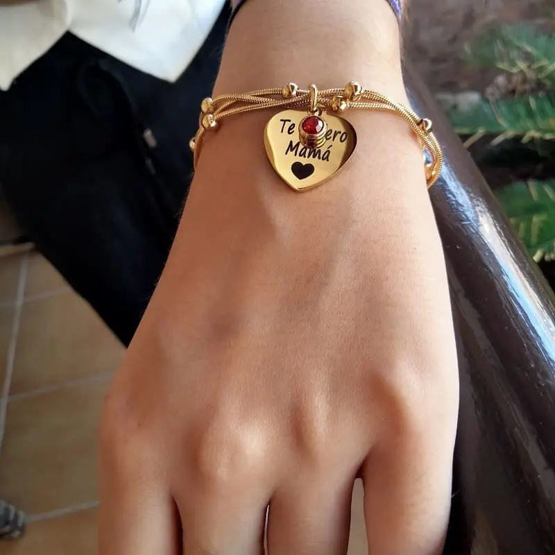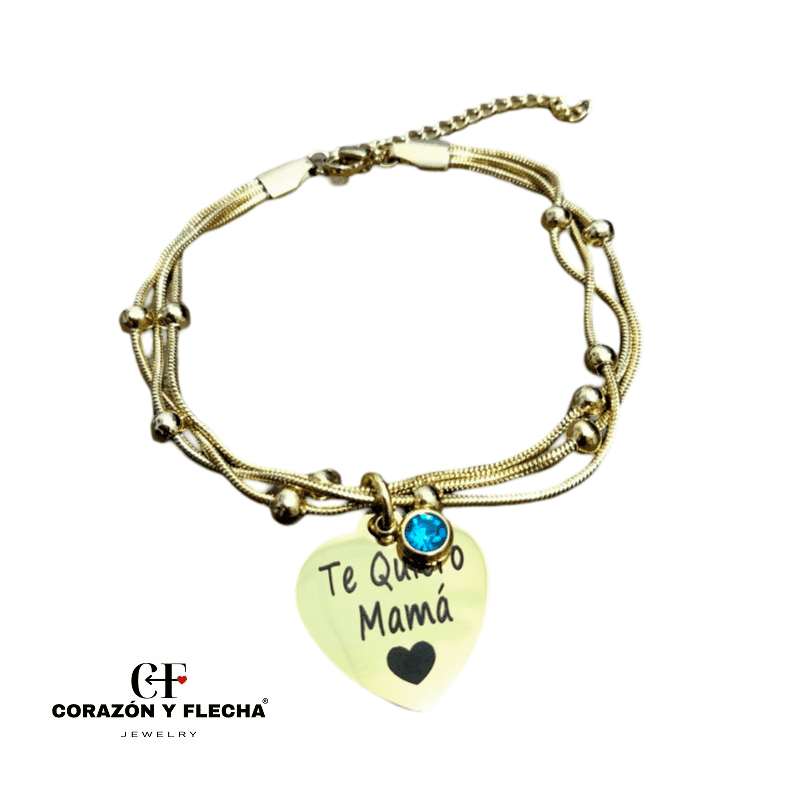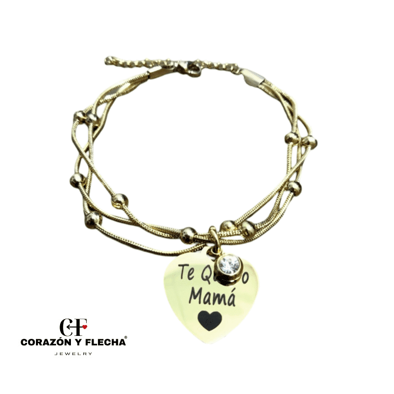 Pulsera mujer de acero dorado, personalizada con corazón de 19x21mm, detalle de cristal, pulsera de 3 tiras, medida 16x3cm.