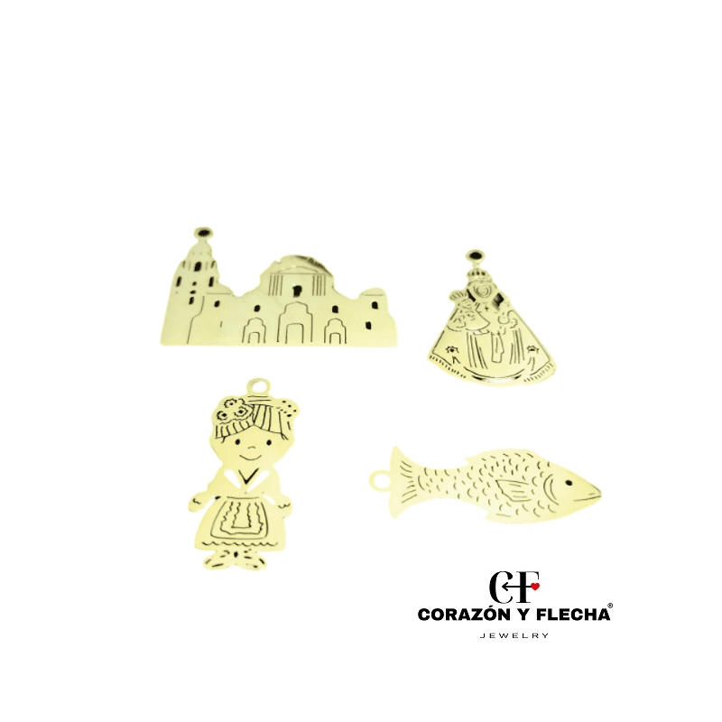 Pulsera Murciana de acero dorada personalizada con 4 colgantes sardina, huertana, virgen de la Fuensanta, catedral y chapa redonda de 19mm,largo 16+3cm.